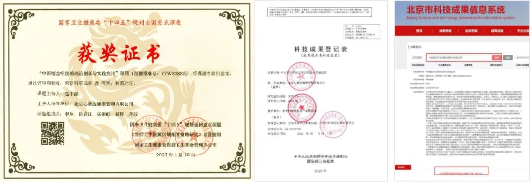 2022年,“中医情志疗法的理论创新与实践应用”项目不仅拿下国家卫生健康委“十四五”规划全国重点课题一等奖,更经北京市科学技术奖励办公室核准完成国家科技成果登记(批准登记号:9112022Y745);
